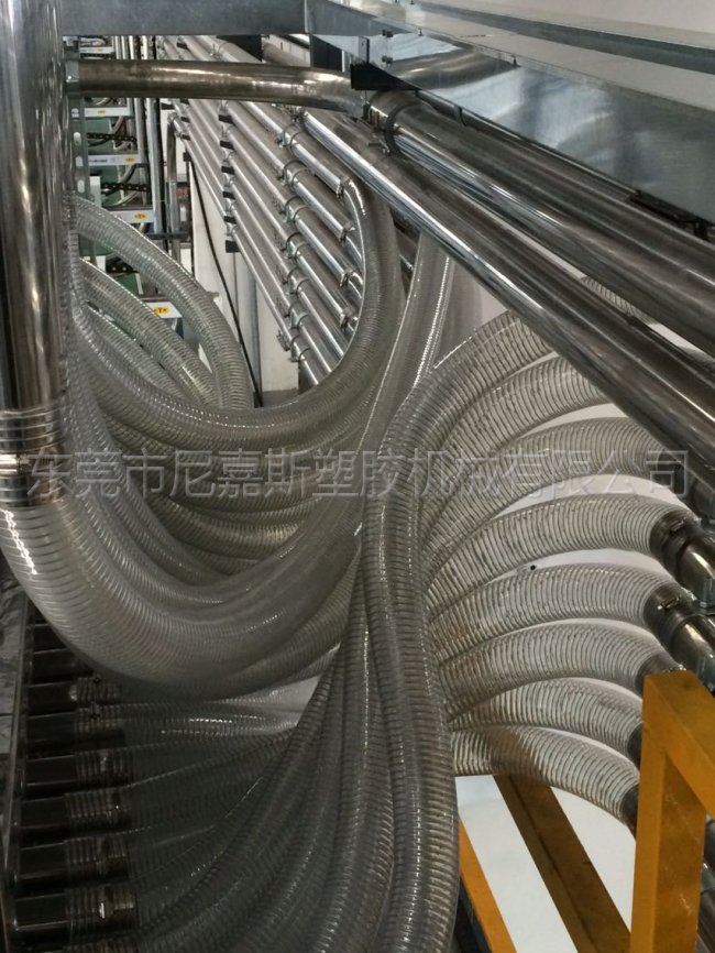 尼嘉斯中央供料系統(tǒng)采用一臺機一根管,密封式回路設計方式,保證整個系統(tǒng)運行穩(wěn)定,絕無塑膠回潮、堵料現象發(fā)生。它配合中央干燥機(除濕機)系統(tǒng)使用,可使干燥空氣對原料進行再次干燥,防止干燥后的塑膠回潮,同時在每個輸送循環(huán)后對輸送管進行清理,確保管道內沒有殘料。在避免原料回潮的同時也保證加入注塑機中原料一致性,在真空負壓同進作用下,原料中原有的粉塵經過過濾器(集塵器)系統(tǒng)濾出,有利提高產品質量。