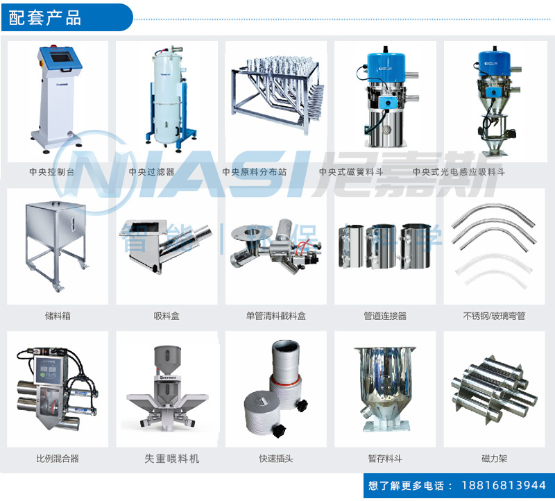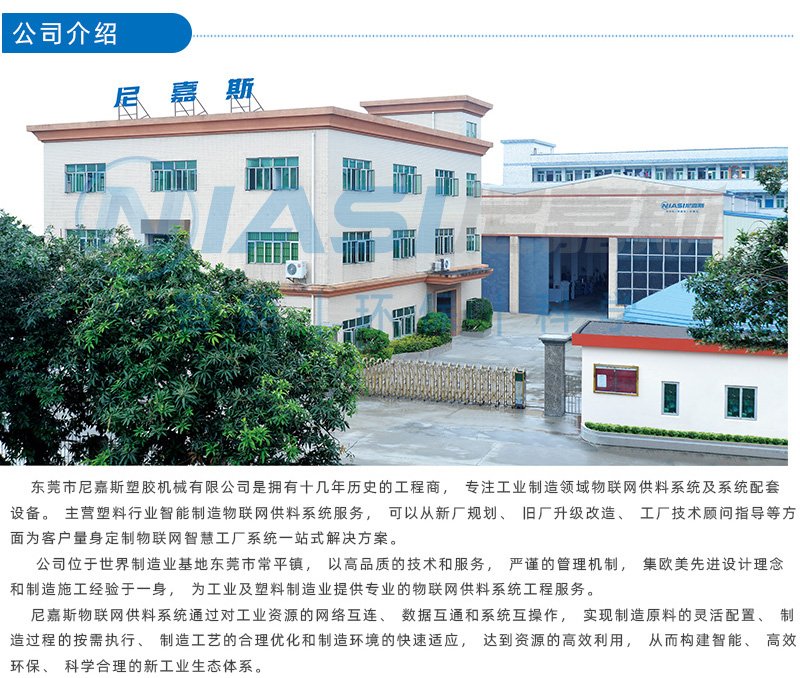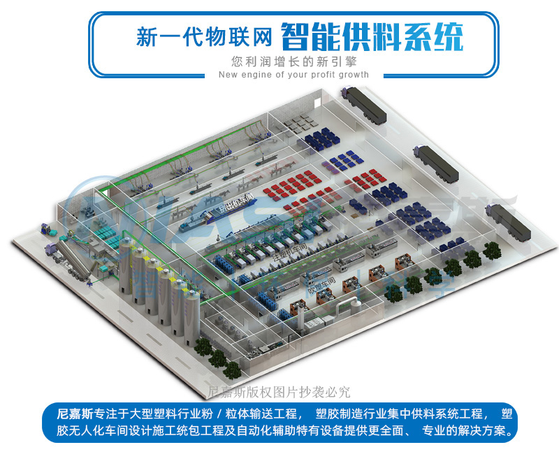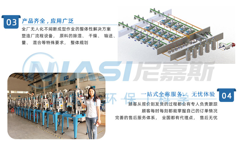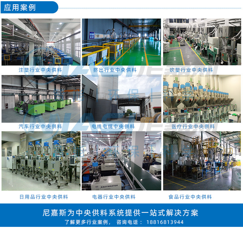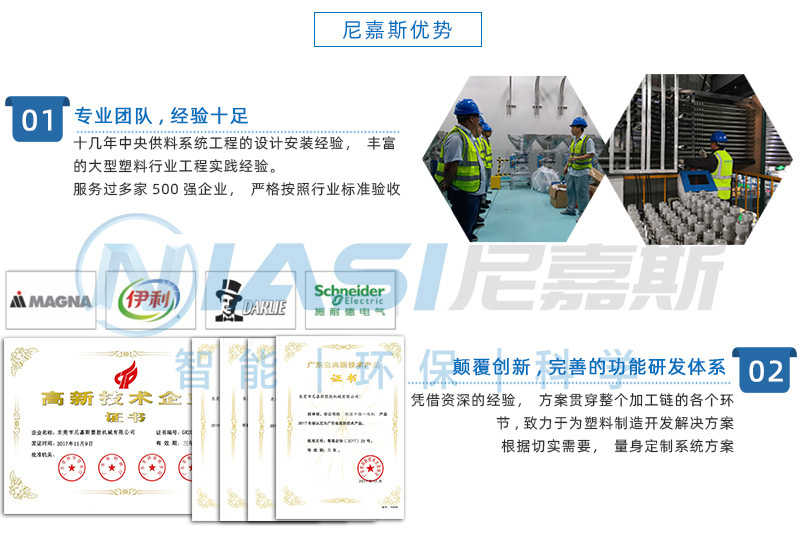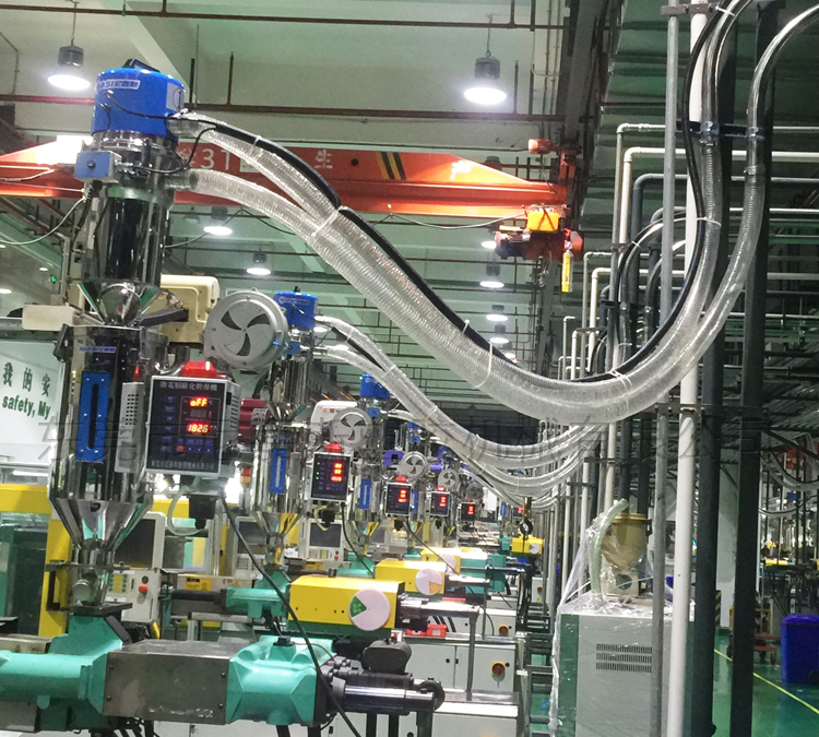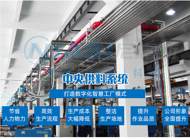 中央供料系統(tǒng)是根據(jù)客戶現(xiàn)場機臺的擺放情況對現(xiàn)場原料的用料情況,結(jié)合特有輔機設(shè)計備而設(shè)計的一種能夠?qū)崿F(xiàn)集中供料、集中控制,從而實現(xiàn)全廠無人化不間斷成型作業(yè)的整體性解決方案。